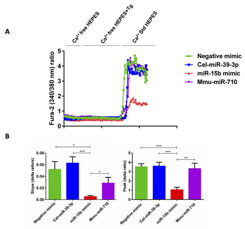 Figure 6: miR-15b mimic overexpression significantly decreased SOCE in activated murine CD4+ T cells. A. Representative tracings showing the 340/380 nm fluorescence ratio reflecting cytosolic Ca2+ activity in Fura-2/AM loaded negative mimic control (green curve), cel-miR-39-3p (blue curve), miR-15b mimic (red curve) and non-specific mmu-miR-710 (violet curve) transfected murine CD4+ T cells following exposure to Ca2+-free HEPES, additional exposure to Tg (1µM) and re-addition of extracellular Ca2+ (Ca2+ Std HEPES). B. Arithmetic means ± SEM (n = 3-6) of the slope (left) and peak (right) of the fluorescence ratio change following re-addition of extracellular Ca2+ in negative mimic control (green bars), cel-miR-39-3p (blue bars), miR-15b mimic (red bars) and non-specific mmu-miR-710 (violet bars) transfected murine CD4+ T cells. *(p < 0.05), **(p < 0.01), ***(p < 0.001) indicates statistically significant difference.