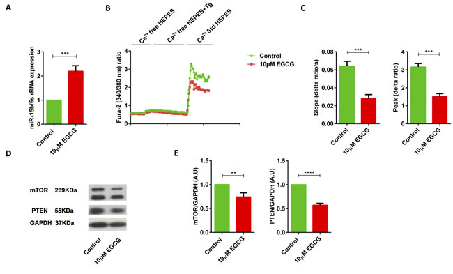 Figure 7: EGCG treatment significantly increased miR-15b expression, decreased SOCE, reduced PTEN and mTOR protein levels in human Jurkat T cells. A. Arithmetic means ± SEM (n = 6) of miR-15b over 5S rRNA transcript levels in human Jurkat T cells following a 72 hours incubation without (green bar) and with 10 µM (red bar) EGCG. ***(p < 0.001), indicates statistically significant difference. B. Representative tracings showing the 340/380 nm fluorescence ratio reflecting cytosolic Ca2+ activity in Fura-2, AM loaded human Jurkat T cells incubated for 72 hours without (green curve) and with 10 µM (red curve) EGCG followed by subsequent exposure to Ca2+-free HEPES, additional exposure to sarcoendoplasmatic Ca2+ ATPase (SERCA) inhibitor thapsigargin (Tg, 1 µM) and re-addition of extracellular Ca2+ (Ca2+ Std HEPES). C. Arithmetic means ± SEM (n = 5) of the slope (left) and peak (right) of the fluorescence ratio change following re-addition of extracellular Ca2+ in human Jurkat T cells incubated for 72 hours without (green bars) and with 10 µM (red bars) EGCG. ***(p < 0.001), indicates statistically significant difference. D. Original Western blots (left panels) and E. arithmetic means ± SEM (n = 4-9, right panels) of mTOR/GAPDH and PTEN/GAPDH protein abundance in human Jurkat T cells incubated for 72 hours without (green bars) and with 10 µM (red bars) EGCG. **(p < 0.01), ****(p < 0.0001) indicates statistically significant difference.
