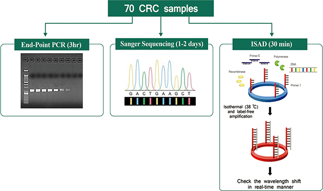 Figure 1: Schematic comparison of three assays. A total of 70 colorectal cancer samples were tested for the KRAS mutations using the indicated detection assays, including end-point PCR (3 h), direct sequencing (1–2 days), and the ISAD-KRAS assay (30 min).