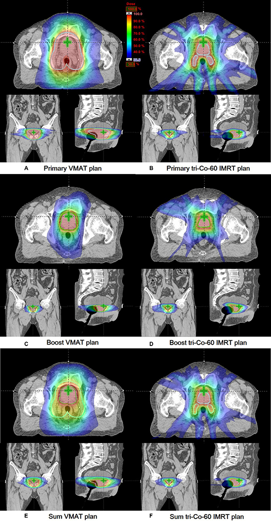 Figure 2: Dose distributions of a representative patient (patient 18) are shown in axial, coronal and sagittal views. Dose distributions of a primary plan (A), boost plan (C), and sum plan (E) of the volumetric modulated arc therapy (VMAT) are shown. Those of a primary plan (B), boost plan (D), and sum plan (F) of the tri-Co-60 intensity-modulated radiation therapy (IMRT) are shown. The primary target volumes and the boost target volumes are delineated with cyan and green colors, respectively.