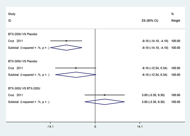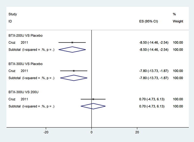One RCT [33] with data for UI episodes per week at 12 weeks was evaluated. Figure 4 show significant reductions in UI episodes per week of NDO in both 200 U and 300 U BTX-A groups compared with placebo at 12 weeks (WMD: −8.50, 95% CI: −14.46 to −2.54, I2 = NA, P = NA; WMD: −7.80, 95% CI: −13.73 to −1.87, I2 = NA, P = NA, respectively.). The outcome of subgroup analysis showed no significant differences between the BTX-A groups (WMD: 0.70, 95% CI: −4.73 to 6.13, I2 = NA, P = NA).