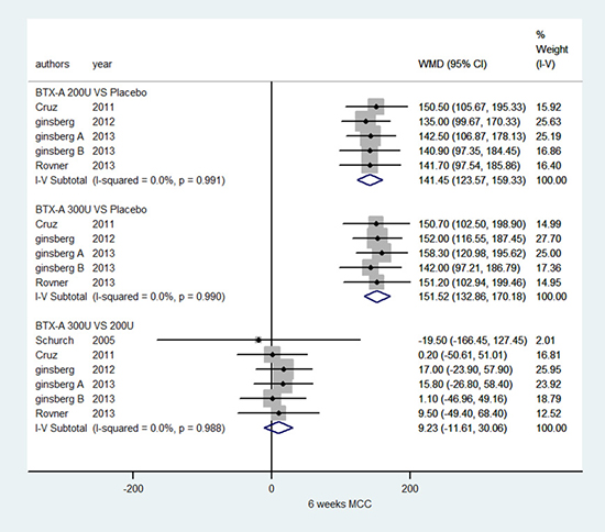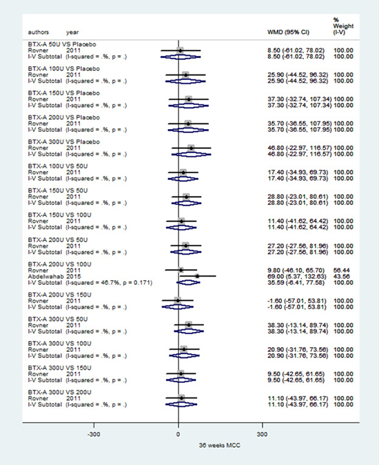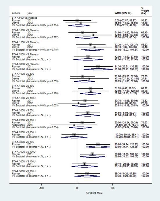 Three RCTs [22, 32, 40] using 5 different doses of BTX-A vs. placebo performed an analysis of MCC; the subgroup details are shown in Figure 6. Figure 6 show that significant improvement was only seen in subgroups of BTX-A 150 U and 300 U vs. placebo, BTX-A 150 U vs. 50 U, BTX-A 300 U vs. 50 U, and BTX-A 300 U vs. 100 U for IDO (WMD: 58.92, 95% CI: 16.02 to 101.81,I2 = 0.0%, P = 0.715; WMD: 81.30, 95% CI: 26.21 to 136.39, I2 = NA, P = NA; WMD: 52.08, 95% CI:12.93 to 91.22, I2 = 0.0%, P = 0.978; WMD: 80.80, 95% CI:34.74 to 126.86, I2 = NA, P = NA; WMD: 59.80, 95% CI:11.53 to 108.07, I2 = NA, P = NA). However, other subgroup results showed no statistical significance.