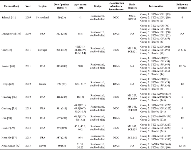 RCTs were included for meta-analysis if the following criteria were met: (1) all patients were diagnosed with urinary incontinence due to OAB, (2) the study population was over 18 years old, (3) the studies compared BTX-A with placebo or different dosages of BTX-A, and (4) the language was limited to English.