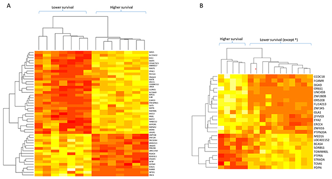 Figure 2: Dendrograms of mRNA levels and patient survival times for patient subgroups with stages I-IIA and IIB tumors. (A) Stage I to IIA tumors (14 samples). (B) Stage IIB tumors (16 samples). The genes included in these analyses are indicated on the right; red: lower mRNA levels, white: higher mRNA levels.
