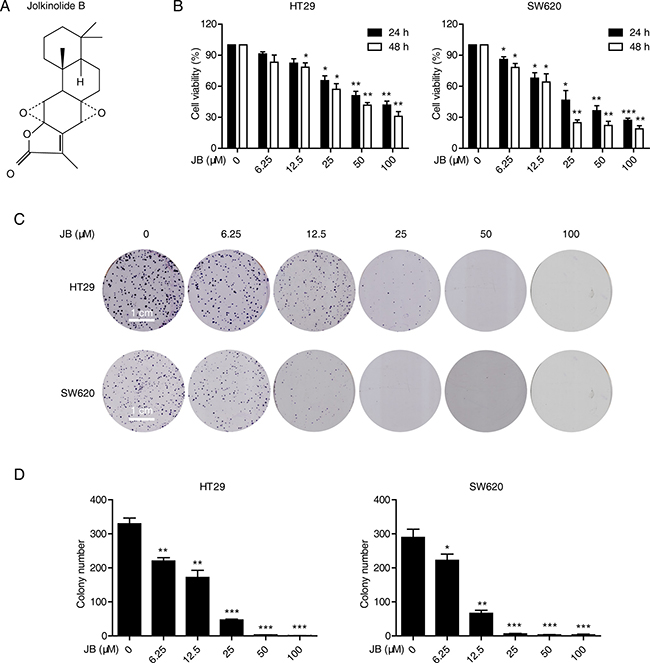 Figure 1: JB inhibits the growth of CRC cells. (A) Chemical structure of JB. (B) HT29 and SW620 cells were incubated with indicated concentrations of JB for 24 and 48 h, the cell viability was determined by WST-1 assay. (C, D) HT29 and SW620 cells were treated with indicated concentrations of JB, Scale bar: 1 cm (C), and their abilities to form colonies were statistically presented in (D). Bars, SEM; N = 3; *P < 0.05, **P < 0.01, ***P < 0.001.