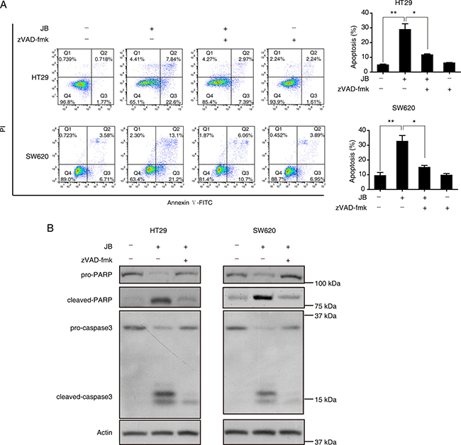 Figure 3: Caspase activation is required for the apoptosis induced by JB in CRC cells. (A) HT29 and SW620 cells were treated with 50 μM or 25 μM JB for 24 h, respectively, in the absence and presence of 10 μM pan-caspase inhibitor z-VAD-fmk, then apoptotic cells were stained with Annexin V/PI and analyzed by flow cytometry. The apoptotic cells including early apoptosis and late apoptosis were statistically presented. Bars, SEM; N = 3; *P < 0.05, **P < 0.01. (B) HT29 and SW620 cells were treated with 50 μM or 25 μM JB for 24 h, respectively, in the absence and presence of 10 μM z-VAD-fmk, and the expression of apoptosis-related proteins including pro-PARP, cleaved-PARP, pro-caspase3, and cleaved-caspase3 were detected by immunoblotting.