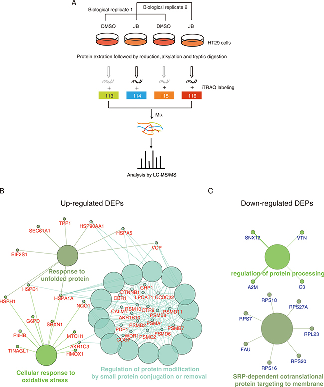 Figure 4: iTRAQ-based proteomics identifies JB-regulated proteins. (A) Experimental flow chart of the identification of JB-regulated proteins. (B, C) DEPs were subjected to the Gene Ontology analysis by ClueGO+CluePedia software, up-regulated proteins (B) and down-regulated proteins (C) were enriched based on biological process, respectively.