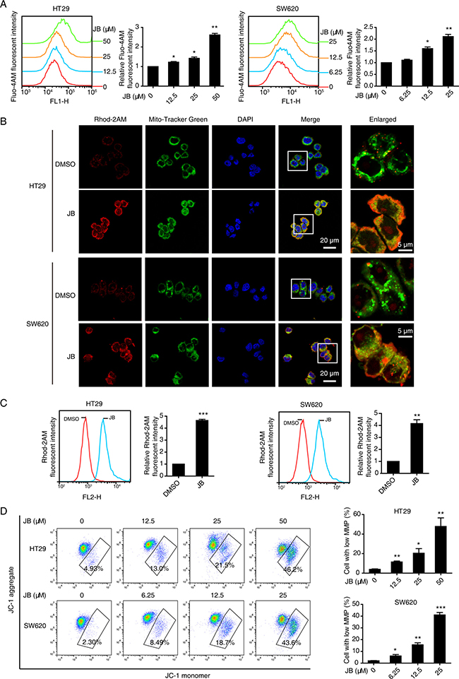 Figure 6: JB induces Ca2+ dysregulation and the loss of mitochondrial membrane potential. (A) HT29 and SW620 cells were treated with indicated concentrations of JB for 24 h, the cytosolic Ca2+ was stained with Fluo-4AM and determined by flow cytometry. (B) HT29 and SW620 cells treated with DMSO or JB for 24 h were stained with 1 μM Rhod-2AM (red), a mitochondrial Ca2+ indicator dye, and 100 nM Mito-Tracker Green and then observed under confocal microscopy. Blue, DAPI. Scale bar = 20 μm; 5 μm (indicated enlargements). (C) The mitochondrial Ca2+ level alterations of HT29 and SW620 cells treated with DMSO or JB were determined by flow cytometry with Rhod-2AM staining. (D) The mitochondrial membrane potential levels of HT29 and SW620 treated with various concentrations of JB were evaluated by JC-1 assay, cells with low mitochondrial membrane potential were quantified. Bars, SEM; N = 3; *P < 0.05, **P < 0.01, ***P < 0.001.
