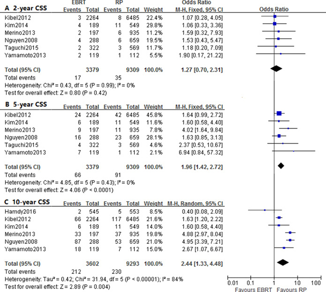 The analyses on 2-year, 5-year and 10-year CSS reported the OR and 95% CI of 1.27 (0.70–2.31, P = 0.42), 1.96 (1.42–2.72, P < 0.0001) and 2.44 (1.33–4.48, p = 0.004), respectively. There was significant heterogeneity observed when assessed the OR of 10-year CSS (I2 = 84%) (Figure 4; Table 3). Two studies provided the CSS of risk stratification, and one studies only reflected 2-year and 5-year survival results. However, there was no death of low or intermediate-risk groups based on two studies, thus significant differences were not found, which may also due to insufficient eligible data.