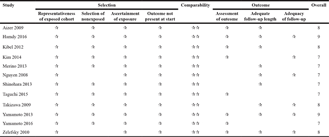 We used Newcastle-Ottawa Scale (NOS) to assess the quality of non-comparative studies [28]. A maximum of 1 star can be allotted in seven aspects of selection and outcome, and the comparability of groups accounted for 2 stars at most, thus the quality scores ranged from 0 to 9. Accordingly, the scores which great than or equal to 7 represented a high quality and low risk of bias, and the studies with scores less than 4 were considered as inferior quality with high risk of bias.