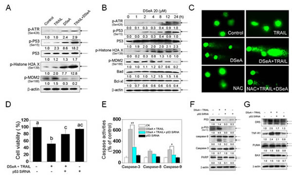 Figure 4: Co-treatment activated DNA damage-mediated p53-dependent apoptotic pathways in A375 cells. (A) Western blot analysis of expression levels of phosphorylated ATR, p53, Histone H2A.X, MDM2 and Total p53 in A375 cells exposed to 20 µM DSeA for 24 h and/or 40 ng/TRAIL for another 24 h. (B) The time course of regulation of phosphorylated ATR, p53, Histone H2A.X, MDM2 and Total p53, Bcl-xl and Bax in A375 cells induced by DSeA. Cells were treated with 20 µM DSeA and harvested at various times. (C) Co-treatment-induced DNA damage in A375 cells. Cells after treatment were immediately analyzed by Comet assay as described in Methods. The length of tail reflects the degree of DNA damage in cells. (D, E) Protective effects of p53 siRNA on co-treatment-induced cell growth inhibition and caspases activation in A375 cells. Cells were pretreated with 50 nmol p53 siRNA for 24 h, and then treated in combination with DSeA and TRAIL. Cell viability was examined by MTT assay. Bars with different characters are statistically different at p < 0.05 level. Caspase activity was measured using synthetic fluorogenic substrate as described in Methods. Each value represents the mean ± SD of three independent experiments, *, p < 0.05; **, p < 0.01 versus the control. (F) Western blot analysis of the inhibitory effects of p53 siRNA on co-treatment-induced cell apoptosis, expression and activation of p53 and caspases.