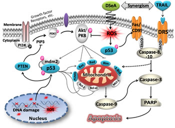 In summary, our data provides compelling evidence that DSeA synergistically enhances the efficacy of TRAIL-induced apoptosis in A375 cells by triggering ROS overproduction, which activated DNA damage-mediated p53 phosphorylation and suppressed PI3K/Akt-mediated resistance (Fig. 7). Our results suggest that the combination of DSeA and TRAIL could be a novel strategy to overcome PI3K/Akt signaling pathway-mediated resistance in malignant melanoma cells and DSeA may be candidates for further evaluation as a chemosensitizer in clinical trails.