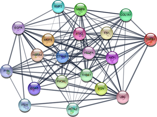 Based on the information in the STRING protein query from public databases, we made the PPI network of the top 15 hub genes with higher degree of connectivity (Figure 1). We selected ACTA2, BGN, MMP2, THBS1, TGFB1, COL1A1, FN1 and ITCH, which with worse overall survival situation according to Kaplan Meier plotter. Based on the GO function, KEGG pathway analysis and the survival analysis, we found that BGN, MMP2, COL1A1 and FN1 were enriched in extracellular matrix, especially in proteinaceous extracellular matrix.