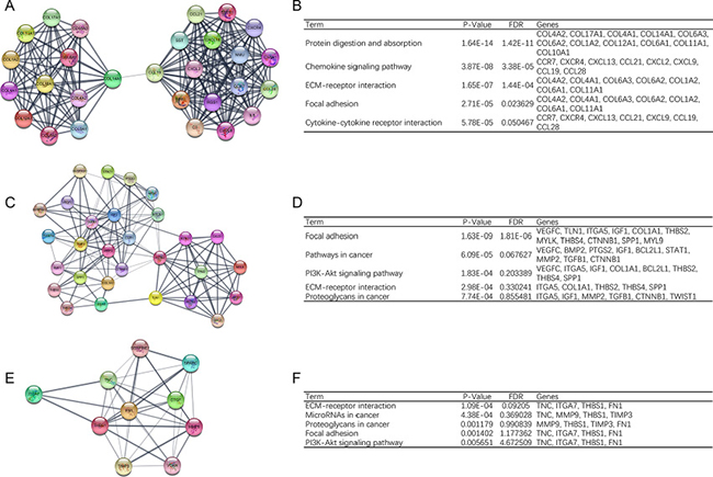 In order to detect significant modules in this PPI network, we used MCODE plug-in. The top 3 modules were selected (Figure 2). KEGG pathway enrichment analysis showed that these three modules were mainly associated with focal adhesion, PI3K-Akt signaling pathway and ECM-receptor interaction (Figure 2).