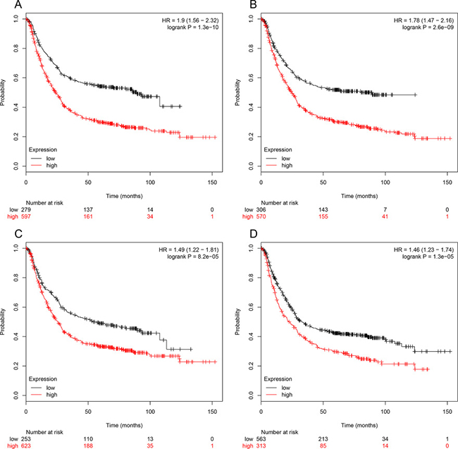 Kaplan Meier-plotter (KM plotter, http://kmplot.com/analysis/) could assess the effect of 54675 genes on survival using 10,461 cancer samples, including 5143 breast, 1816 ovarian, 2437 lung and 1,065 gastric cancer patients with a mean follow-up of 69, 40, 49 and 33 months [9]. The relapse free and overall survival information were based on GEO (Affymetrix microarrays only), EGA and TCGA database. The hazard ratio (HR) with 95% confidence intervals and log rank P value were calculated and displayed on the plot.