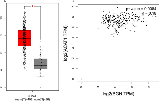 Figure 4: (A) Expression level of BGN in cancer and normal tissues. STAD: Stomach Adenocarcinoma; *P < 0.05. (B) The correlation analysis between BGN and ACAT1. BGN and ACAT1 are obviously positively correlated.