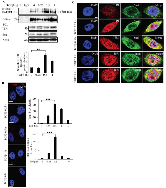 Figure 2: Snail1 interacts with TβRI. A. PC-3U cells were treated with TGFβ for the indicated time periods. Cell lysates were prepared and immunoprecipitated with goat-Snail1 and immunoblotted with rabbit TβRI antibodies. Total cell lysates were probed for endogenous TβRI, Snail1, and β-actin (n = 4 independent experiments). B. PLA images of PC-3U cells were treated with TGFβ for the indicated time periods. Cells were fixed, permeabilised and incubated with anti-rabbit TβRI and anti-mouse Snail1 antibodies, followed by incubation with PLA probes. TβRI-Snail1 PLA complexes are visualized as red dots. Quantification of TβRI-Snail1 complexes was done with the aid of Blob finder software. (n = 4 independent experiments). C. Representative confocal imaging of PC-3U cells treated with TGFβ for the indicated time periods. Cells were fixed, permeabilised and incubated with anti-rabbit TβRI and anti-mouse Snail1 antibodies, followed by incubation with Alexa Fluor 555 (red) secondary anti-rabbit antibodies and Alexa Fluor 488 (green) secondary anti-mouse antibodies for visualization. Merge of two layers shows co-localization of the proteins. Cell nuclei stained with DAPI (n = 3 independent experiments). Scale bar, 20 µm. Bar graphs show the means ± SEM; **P < 0.005, ***P < 0.0005. Differences in the means ± SEM between samples were analyzed with two-way ANOVA and Bonferroni correction for multiple comparisons.