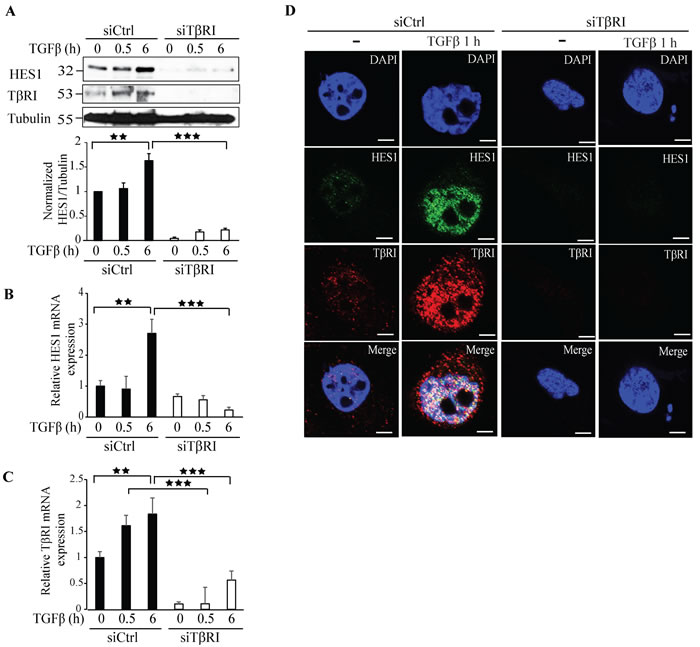 Since we observed that silencing of TβRI decreased Hes1 expression, we next investigated if overexpression of HA-TβRI could affect regulation of Hes1. Results from qRT-PCR analysis, showed an enhanced expression of Hes1 upon TGFβ stimulation at increasing concentrations of HA-TβRI (Supplementary Figure 7A), suggesting that Hes1 is a target gene of TβRI. However, the expression of Snail1 and Twist1 was slightly enhanced upon TGFβ stimulation at increasing concentrations of HA-TβRI, but not as much as in TGFβ-stimulated cells alone (Supplementary Figure 7B-7C). As expected, TGFβ stimulation enhanced the expression of TβRI mRNA (Supplementary Figure 7D). These results further strengthen the notion that TβRI regulates Hes1 expression.