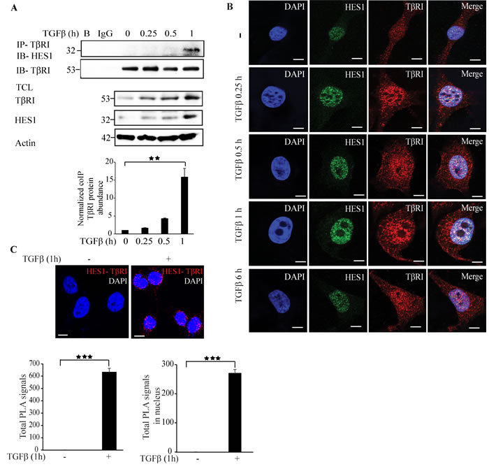 Figure 5: Hes1 interacts with TβRI. A. PC-3U cells were treated with TGFβ for the indicated time periods. Cell lysates were prepared and immunoprecipitated with rabbit-TβRI and immunoblotted with rabbit-Hes1 antibodies. Total cell lysates were probed for endogenous TβRI, Hes1, and β-actin. (n = 4 independent experiments). B. Representative confocal imaging of PC-3U cells treated with TGFβ for the indicated time periods. Cells were fixed, permeabilised and incubated with anti-rabbit TβRI and anti-mouse Hes1 antibodies, followed by incubation with Alexa Fluor 555 (red) secondary anti-rabbit antibodies and Alexa Fluor 488 (green) secondary anti-mouse antibodies for visualization. Merge of two layers shows co-localization of the proteins. Cell nuclei stained with DAPI. (n = 3 independent experiments). Scale bar, 20 µm. C. PLA images of PC-3U cells were treated with TGFβ for the indicated time periods. Cells were fixed, permeabilised and incubated with anti-rabbit TβRI and anti-mouse Hes1 antibodies, followed by incubation with PLA probes. TβRI-Hes1 PLA complexes are visualized as red dots. Quantification of TβRI-Snail1 complexes was done with the aid of Blob finder software. (n = 3 independent experiments). Scale bar, 20 µm. Bar graphs show the means ± SEM; **P < 0.005, ***P < 0.0005. Differences in the means ± SEM between samples were analyzed with two-way ANOVA and Bonferroni correction for multiple comparisons.
