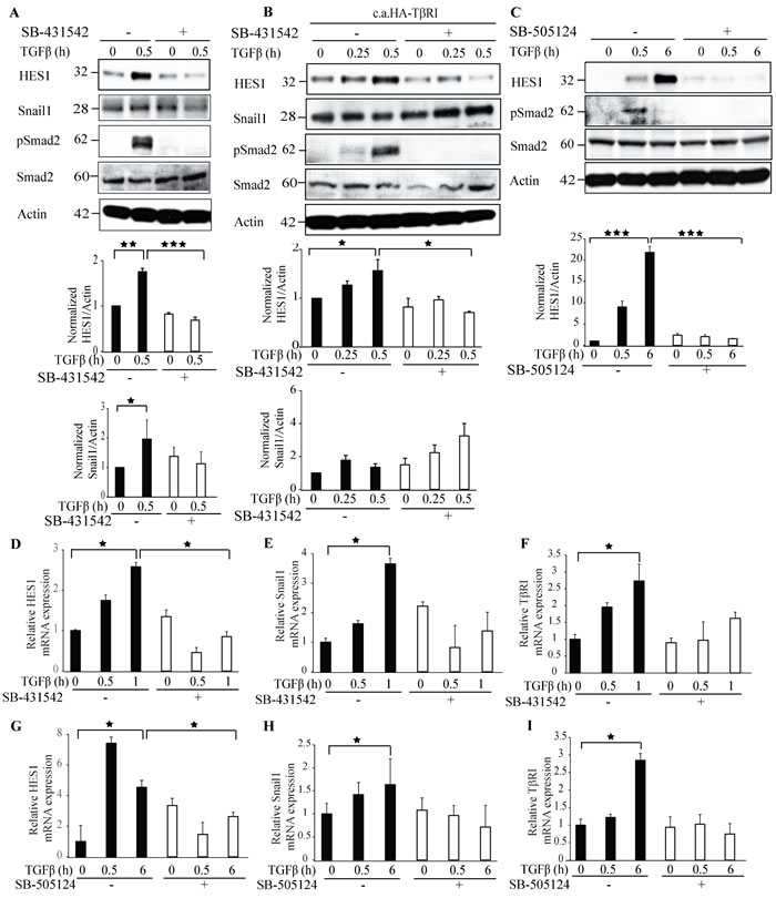 Next, we performed qRT-PCR experiments with RNA extracted from these samples. Hes1 mRNA expression decreased significantly upon treatment with the TβRI kinase inhibitors SB-431542 or SB-505124 (Figure 6D, 6G); in contrast, Snail1 and TβRI expression was partially decreased upon TGFβ stimulation (Figure 6E, 6H), (Figure 6F, 6I). These results further corroborate the notion that TβRI induces Hes1 expression and the kinase activity of the TβRI is required for the regulation of Hes1 expression.