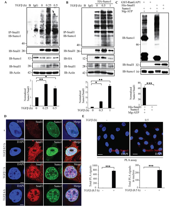 Figure 7: TGFβ stimulates sumoylation of Snail1. A. PC-3U cells were treated with TGFβ for the indicated time periods. Cell lysates were subjected to sumoylation assay and immunoprecipitated with goat-Snail1 and immunoblotted with rabbit-Sumo1 antibodies. Total cell lysates were probed for endogenous Sumo1, Snail1, and β-actin. (n = 5 independent experiments). B. PC-3U cells were transiently transfected with HA-Sumo1 and treated with TGFβ for the indicated time periods. Cell lysates were subjected to sumoylation assay and immunoprecipitated with goat-Snail1 and immunoblotted with rabbit-Sumo1 antibodies. Total cell lysates were probed for HA and endogenous Snail1, and β-actin. (n = 5 independent experiments). C. His-Snail1 and GST-RanGAP1 (positive control) incubated with Sumo1 was subjected to in vitro sumoylation reaction for 60 min in the presence or absence of Mg-ATP. Reaction was terminated by adding sample buffer and boiling at 95°C. Samples were immunoblotted with anti-Sumo1 and anti-Snail1 antibodies. (n = 6 independent experiments). D. Representative confocal imaging of PC-3U cells treated with TGFβ for the indicated time periods. Cells were fixed, permeabilised and incubated with anti-mouse Snail1 and anti-rabbit Sumo1 antibodies, followed by incubation with Alexa Fluor 555 (red) secondary anti-mouse antibodies and Alexa Fluor 488 (green) secondary anti-rabbit antibodies for visualization. Merge of two layers shows co-localization of the proteins. Cell nuclei stained with DAPI. (n = 3 independent experiments). Scale bar, 20 µm; E. PLA images of PC-3U cells were treated with TGFβ for the indicated time periods. Cells were harvested, fixed, permeabilised and incubated with anti-rabbit Sumo1 and anti-mouse Snail1 antibodies, followed by incubation with PLA probes. Sumo1-Snail1 PLA complexes are visualized as red dots. Quantification of Sumo1-Snail1 PLA complexes was done with the aid of Blob finder software. (n = 3 independent experiments). Scale bar, 20 µm. Bar graphs show the means ± SEM; *P < 0.05, *P < 0.005, ***P < 0.0005. Differences in the means ± SEM between samples were analyzed with two-way ANOVA and Bonferroni correction for multiple comparisons.