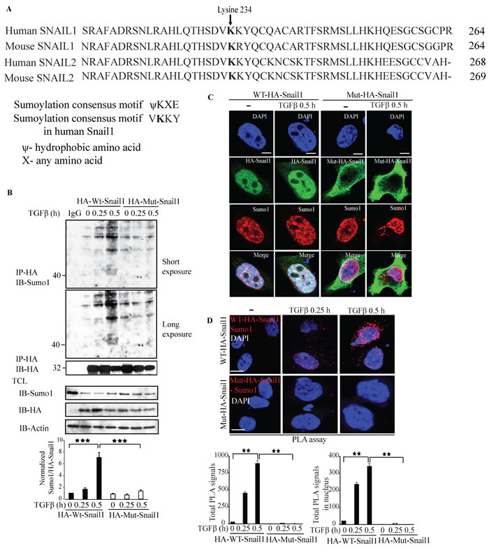 Figure 8: Lysine 234 is required for Sumo1 modification of Snail1. A. In silico analysis using Clustal W alignment of protein sequences of Snail1 and Snail2 (slug) of human and mice showing conserved lysine (K) residues. B. PC-3U cells were transiently transfected with HA-WT-Snail1 or Mutant-HA-Snail1 and treated with TGFβ for the indicated time periods. Cell lysates were subjected to sumoylation assay and immunoprecipitated with mouse-HA antibodies and immunoblotted with rabbit-Sumo1, mouse-HA antibodies. Total cell lysates were probed for endogenous Sumo1, HA, and β-actin. (n = 5 independent experiments). C. Representative confocal imaging of PC-3U cells transiently transfected with HA-WT-Snail1 or Mutant-HA-Snail1 and treated with TGFβ for the indicated time periods. Cells were harvested, fixed, permeabilised and incubated with anti-mouse HA-Snail1 and anti-rabbit Sumo1 antibodies, followed by incubation with Alexa Fluor 555 (red) secondary anti-rabbit antibodies and Alexa Fluor 488 (green) secondary anti-mouse antibodies for visualization. Merge of two layers shows co-localization of the proteins. Cell nuclei stained with DAPI. (n = 3 independent experiments). Scale bar, 20 µm. D. PLA images of PC-3U cells transiently transfected with HA-WT-Snail1 or Mutant-HA-Snail1 and treated with TGFβ for the indicated time periods. Cells were harvested, fixed, permeabilised and incubated with anti-rabbit Sumo1 and anti-mouse HA antibodies, followed by incubation with PLA probes. Sumo1-HA-Snail1 PLA complexes are visualized as red dots. Quantification of Sumo1- HA-Snail1 PLA complexes was done with the aid of Blob finder software. (n = 3 independent experiments). Scale bar, 20 µm. Bar graphs show the means ± SEM; *P < 0.05, **P < 0.005, ***P < 0.0005. Differences in the means ± SEM between samples were analyzed with two-way ANOVA and Bonferroni correction for multiple comparisons.