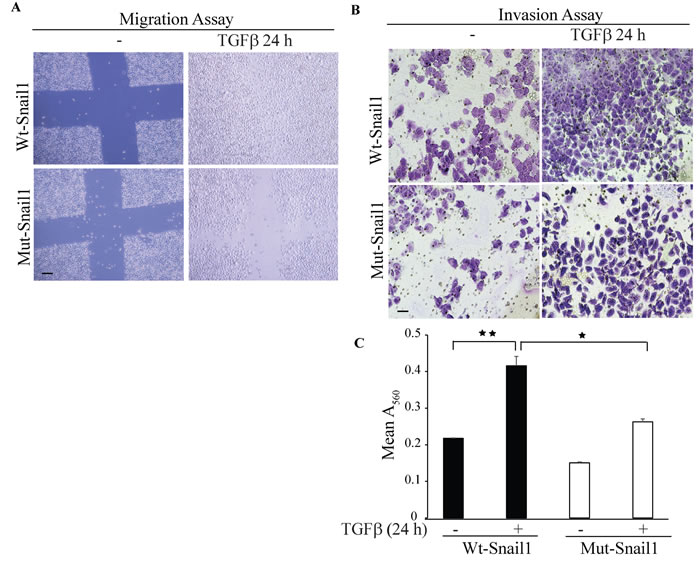 Scratch wound healing assays using PC-3U cells were performed in 6-well plates. Cells were transfected with either wt-Snail1 or mutant-Snail1. Cells were serum-starved prior to creating an approximately 0.6 mm wide wound using a pipette tip. Thereafter, cells were stimulated with TGFβ for 24 h. Images were taken by a microscope with a digital camera, using QED software.