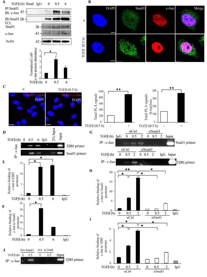 Snail1 has been reported to bind to its own promoter and to regulate its own expression [29]. Previously, we reported that TGFβ induced transcription of Snail1 requires c-Jun and c-Jun binds to specific distal region of the Snail1 promoter [30, 31]. Immunoprecipitation experiments confirmed that TGFβ stimulates interaction and co-localization between Snail1 and c-Jun (Figure 10). We report here that c-Jun binds to TβRI and Snail1 promoter to regulate their expression respectively. Moreover, TGFβ induced Snail1 protein is crucial for c-Jun to bind to TβRI and Snail1 promoters (Figure 10), suggesting that the Snail1 transcription factor might recruit other co-activators such as c-Jun, to bind to TβRI or to its own promoter region. Interestingly, only the wt-Snail1 promoted c-Jun binding to TβRI promoter, compared to the Lysine 234 mutant Snail1, to promote transcription of EMT genes, including TβRI and c-Jun (Figure 10, Supplementary Figure 11, 12).