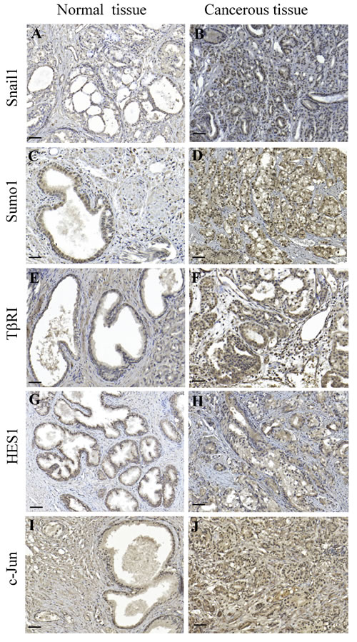 As we have observed that Snail1 is critical for EMT regulation in prostate cancer, we performed immunohistochemical stainings for Snail1, Sumo1, TβRI, Hes1 and c-Jun, in prostate cancer tissues. Increased positive stainings for Snail1, Sumo1, TβRI, Hes1, and c-Jun were found in the investigated prostate cancer tissues compared to the normal tissues (Figure 11A-11J), suggesting that TGFβ-promoted prostate cancer progression, involves increased expression of these EMT promoting factors. No immunohistochemical stainings for Snail1, Sumo1, TβRI, Hes1 and c-Jun was observed in control experiment when the primary antibodies were omitted) (Supplementary Figure 13A-13E).