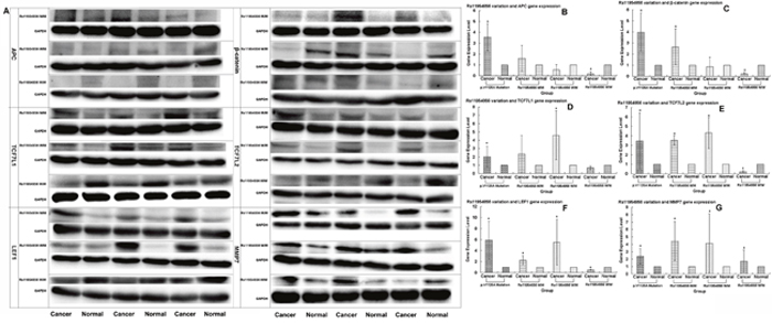 In this study, we found that the APC gene SNP rs11954856 was associated with colorectal cancer and increased the expression levels of genes in the Wnt/β-catenin signaling pathway in the CRC patients (Figure 4). Of remarkable significance, the p.1125Val>Ala mutation in the APC gene, previously reported for its association with the FAP syndrome [32], also increased the expression levels of all the genes downstream of APC gene in the Wnt/β-catenin signaling pathway in the CRC patients, including APC, β-catenin, TCF7L1, TCF7L2, LEF1, MMP7, C-myc, C-jun, and CYCLIND1, and GSK-3β for feedback located upstream of the APC gene (Figure 4).