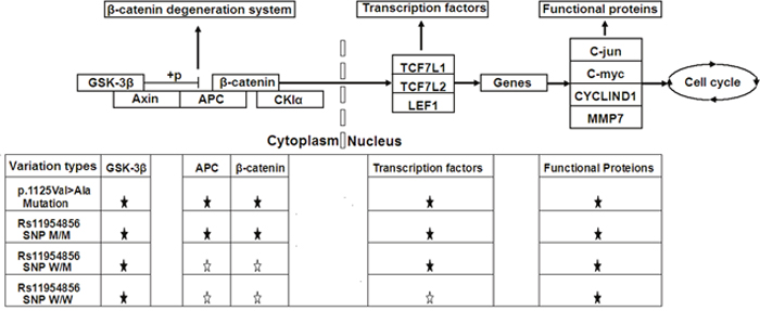 Figure 4: Schematic diagrams of Wnt/β-catenin signaling pathway. Shown here are influences of rs11954856 and the p.1125Val>Ala mutation in APC gene on the expression levels of genes in the pathway in CRC patients. ★ denotes statistically significant and ☆ denotes no statistical differences.