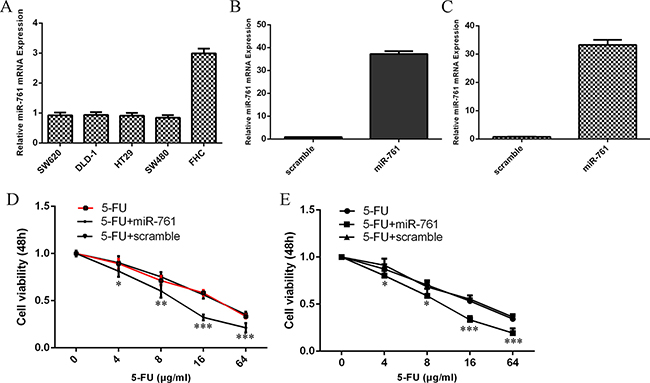 Figure 1: miR-761 promoted the sensitivity of colorectal cancer cells to 5-FU. (A) The miR-761 expression in the colorectal cancer cell (HT29, SW480, SW620 and DLD-1) and normal colon epithelium cell line (FHC) was detected by qRT-PCR analysis. U6 was used as the internal control. (B) The expression level of miR-761 in the HT29 cell treated with miR-761 mimic was measured by qRT-PCR analysis. (C) The expression level of SW480 in the HT29 cell treated with miR-761 mimic was measured by qRT-PCR analysis. (D) The response of HT29 cells to 5-FU was increased after treated with the miR-761 mimic compared to the scramble-transfected cells. (E) The response of SW480 cells to 5-FU was increased after treated with the miR-761 mimic compared to the scramble-transfected cells. *p < 0.05; **p < 0.01 and ***p < 0.001.