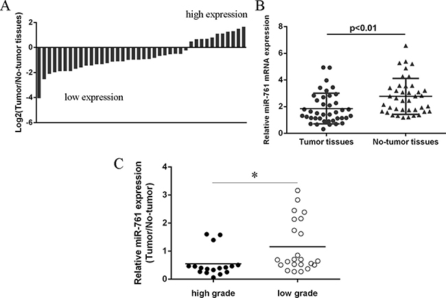 Figure 2: miR-761 expression was downregulated in colorectal cancer tissues. (A) The miR-761 expression in the colorectal cancer tissues and the adjacent non-tumor tissues was determined by qRT-PCR. U6 was used as the internal control. (B) The expression of miR-761 was lower in the colorectal cancer samples compare to the non-tumor samples. (C) The miR-761 expression was lower in the colorectal cancer patients with low grade than in the patients with low grade. *p < 0.05.