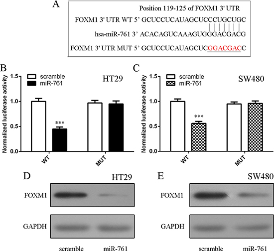 Figure 5: FOXM1 was a direct target gene of miR-761. (A) The putative binding sites of miR-761 and FOXM1 are shown. (B) Ectopic expression of miR-761 decreased the luciferase activity of wild-type 3′UTR of the FOXM1 construct, but not in the mutated-type 3′UTR of the FOXM1 vector in the HT29 cell. (C) Elevated expression of miR-761 decreased the luciferase activity of wild-type 3′UTR of the FOXM1 construct, but not in the mutated-type 3′UTR of the FOXM1 vector in the SW480 cell. (D) The protein expression of FOXM1 was measured by Western blot. GAPDH was used the internal control. (E) Elevated expression of miR-761 inhibited the protein expression of FOXM1 both in the SW480 cell. ***p < 0.001.