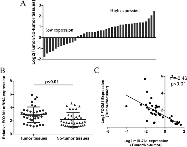 Figure 6: FOXM1 expression was upregulated in colorectal cancer tissues. (A) The FOXM1 expression in the colorectal cancer tissues and adjacent non-tumor tissues was measured by qRT-PCR and U6 was used as the internal control. (B) The expression of FOXM1 was higher in the colorectal cancer samples than in the non-tumor samples. (C) The miR-761 expression was negatively associated with the expression of FOXM1 in the colorectal cancer tissues.