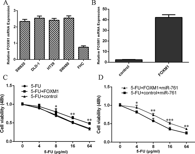 Figure 7: miR-761 promoted the sensitivity of colorectal cancer cells to 5-FU through targeting FOXM1. (A) The expression level of FOXM1 in the olorectal cancer cell (HT29, SW480, SW620 and DLD-1) and normal colon epithelium cell line (FHC) was measured by qRT-PCR. (B) The expression of FOXM1 in the HT29 cell with FOXM1 vector was determined by qRT-PCR. (C) The response of HT29 cell to 5-FU was enhanced after treated with the FOXM1 vector compared with the cotrol-transfected cells. (D) The response of miR-761-overexpressing HT29 cell to 5-FU was rescued after transfection with the FOXM1 construct compared to the control vector. *p < 0.05; **p < 0.01 and ***p < 0.001.