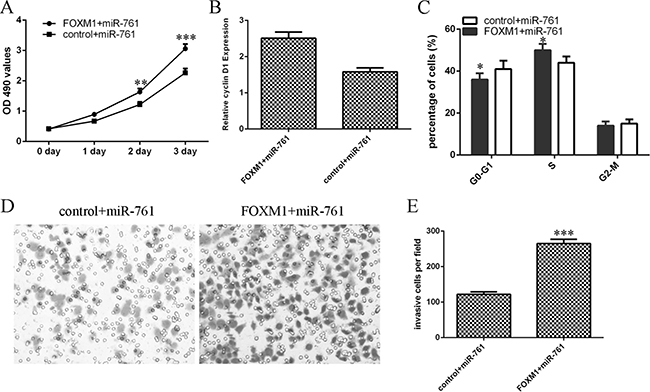 Figure 8: miR-761 suppressed the colorectal cancer cell proliferation and invasion by downregulating FOXM1. (A) Overexpression of FOXM1 rescued miR-761-overexpressing HT29 cell proliferation. (B) The mRNA expression of FOXM1 was measured by qRT-PCR. GAPDH was used as the internal control. (C) Elevated expression of FOXM1 promoted the miR-761-overexpressing HT29 cell cycle. (D) miR-761 overexpression increased the miR-761-overexpressing HT29 cell invasion. (E) The relative invasive cells were shown. *p < 0.05; **p < 0.01 and ***p < 0.001.