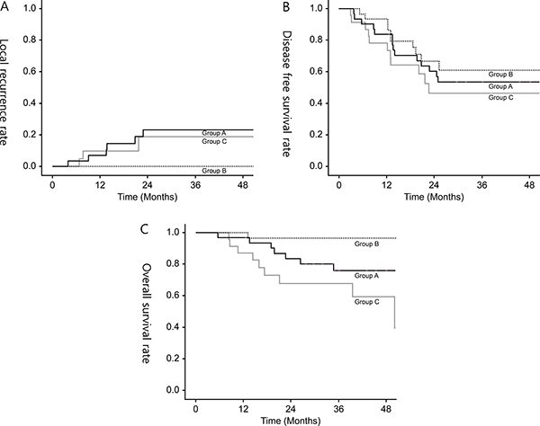 Figure 2: (A) 3-year local recurrence rate, (B) 3-year disease-free survival rate, (C) 3-year overall survival rate in all groups.