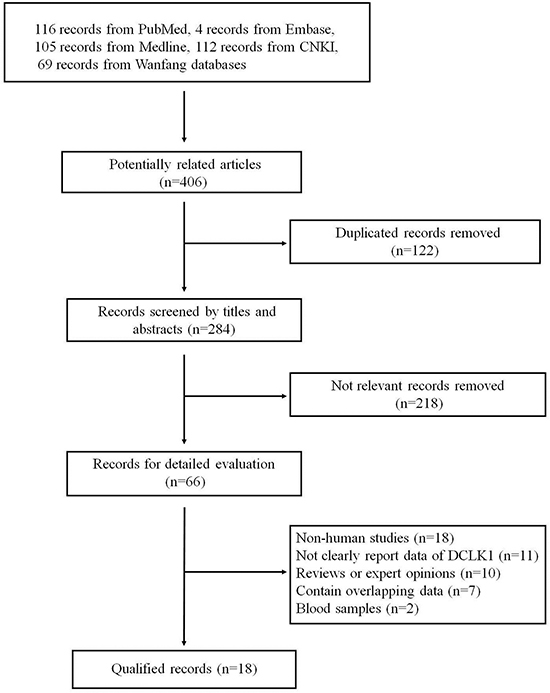 The complete literature search yielded 406 articles: 116 from PubMed, 105 from Medline, 4 from Embase, 112 from Chinese National Knowledge Infrastructure (CNKI) and 69 from Wanfang databases. And 284 articles were screened based on titles and abstracts after removing 122 duplicates. Among these articles, 266 articles were excluded for the following reasons: obviously not relevant to the topic (n = 218), non-human studies (n = 18), not clearly report data of DCLK1 (n = 11), reviews or expert opinions (n = 10), contain overlapping data (n = 7), serum samples (n = 2). Finally, 18 articles were included in this meta-analysis. Figure 1 is a flow diagram outlining the study-selection process.