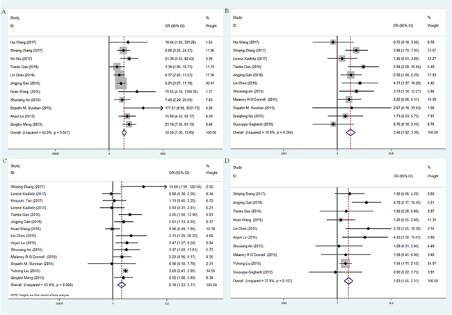Figure 2: Forest plot of odd ratio (OR) of subgroup analysis. (A) subgroup analysis based on control tissues; (B) subgroup analysis based on TNM stage; (C) subgroup analysis based on lymphatic metastasis; (D) subgroup analysis based on differentiation.