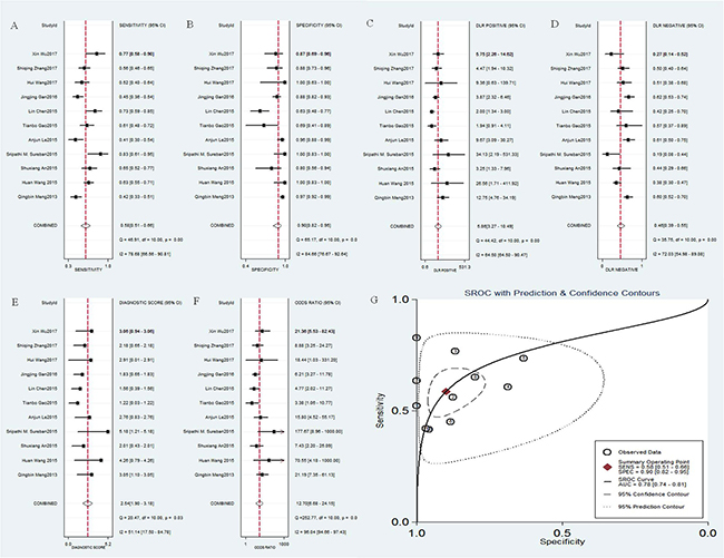 Figure 4: Diagnostic accuracy of DCLK1 in cancer. (A) sensitivity of DCLK1 for the diagnosis of cancer; (B) specificity of DCLK1 for the diagnosis of cancer; (C) positive likelihood ratio (PLR) of DCLK1 for the diagnosis of cancer; (D) negative likelihood ratio (NLR) of DCLK1 for the diagnosis of cancer; (E) diagnostic score of DCLK1 for the diagnosis of cancer; (F) diagnostic odds ratio (DOR) of DCLK1 for the diagnosis of cancer; (G) the corresponding area under the SROC curve (AUC) of DCLK1 for the diagnosis of cancer.
