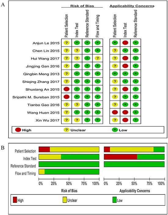 Figure 6: Assessment of methodological quality of diagnostic accuracy studies. (A) risk of bias and applicability concerns summary; (B) risk of bias and applicability concerns graph.