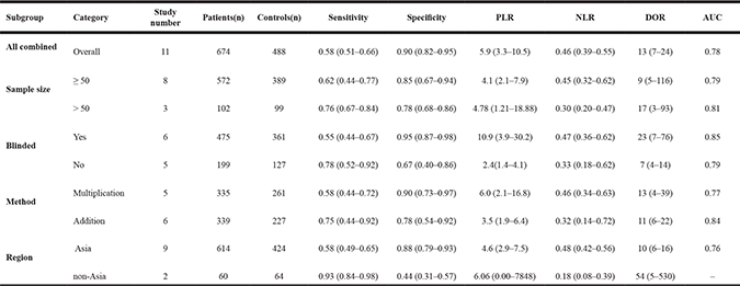 PLR, positive likelihood ratio; NLR, negative likelihood ratio; DOR, diagnostic odds ratio; AUC, corresponding area under the summary receiver operating characteristic curve.