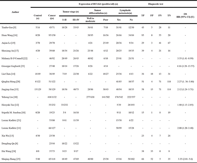 As shown in Table 1, 18 studies [8–25] investigated the association between DCLK1 expression and clinicopathological characteristics in patients with cancer from 2012 to 2017, containing a total of 2660 patients with the sizes of studies distributing from 23 [18] to 1132 [10] patients. All studies were retrospective, and most of studies adopted immunohistochemistry (IHC) to detect the expression of DCLK1 in cancer tissues samples that composed of malignant cell and a supporting stroma, while one adopted reverse transcription-polymerase chain reaction (RT-PCR). The source of the malignant tumor included PDAC [8], CRC [9, 16, 17, 19, 22, 23], BCA [10, 15], head and neck squamous cell carcinoma (HNSCC) [11], non-small cell lung cancer (NSCLC) [12], oral squamous-cell carcinoma (OSCC) [13], gastric cancer (GC) [14, 20], hepatocellular carcinoma (HCC) [18], salivary gland carcinoma (SGC) [21], malignant pleural mesothelioma (MPM) [24] and bladder cancer (BC) [25]. In these studies, most of investigations were in Asia, including China and Japan. Four studies were in America [8, 18, 23, 24], and two studies were in Austria [11, 21].