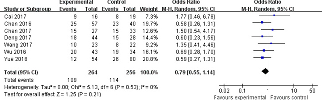 Figure 6: Forest plot (random effects model) describing the association of the LINC00152 with tumor recurrence. The expression of LINC00152 was significantly associated with tumor recurrence.