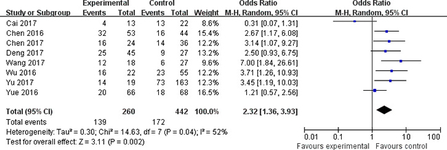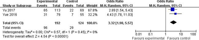 Figure 4: Forest plot (random effects model) describing the association of the LINC00152 with lymph node metastasis. The expression of LINC00152 was significantly associated with the lymph node metastasis.
