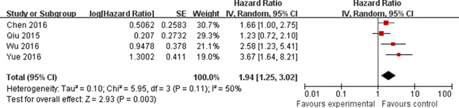 Figure 7: Forest plot (random effects model) describing the association of the LINC00152 with overall survival of cancer. The expression of LINC00152 was significantly associated with overall survival of cancer.