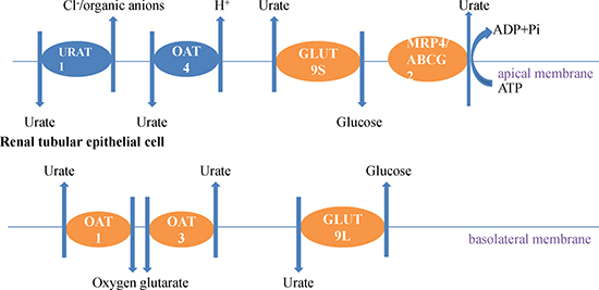 Excretion of uric acid in the kidney is carried out with the assistance of uric acid transporters, and the transporters are divided into two categories: urate reabsorption transporters and urate excretion transporters [14].