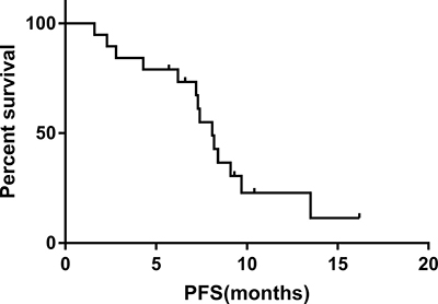 Figure 1: Progression-free survival in patients with advanced hepatocellular carcinoma and PVTT treated with combined apatinib and TACE. The median progression-free survival was 8.1 months, with 6-month and 1-year rates of 73.3% and 22.9%, respectively.