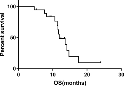 Figure 2: Overall survival in patients with advanced hepatocellular carcinoma and PVTT treated with combined apatinib and TACE. The median overall survival was 11.9 months, with 6-month and 1-year rates of 94.7% and 48.8%, respectively.